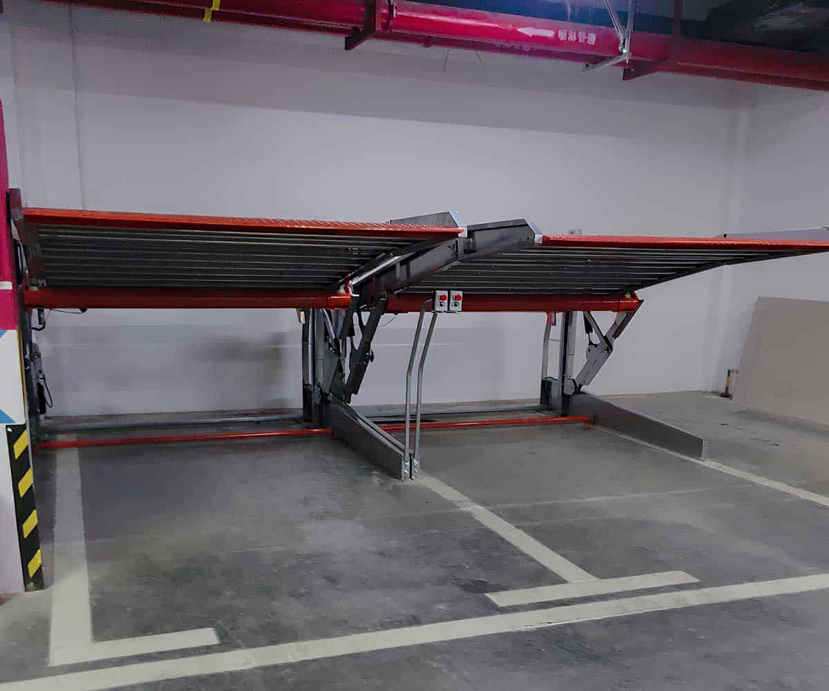 俯仰简易立体车库传动系统采用液压传动的方式,液压泵利用高压油推动液压缸,驱动载车板上升或下降,达到存取车辆的目的。地面停车位,待载车板上升到位后,即可驶入或驾出车辆。设备更大上升高度为1750毫米。更大提升重量2000公斤。适用于停放轿车。俯仰式载车板倾斜设计,使有限的空间得到了充分的利用。该设备需要的净高度不低于3100